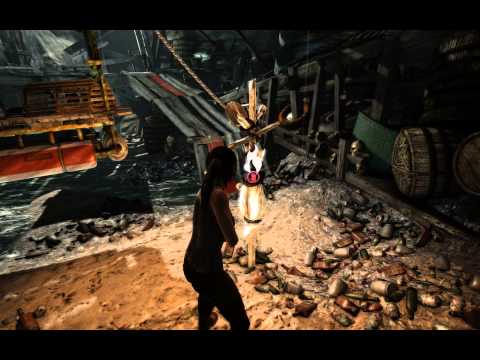 Начинаем прохождение игры Tomb Raider (2013) с просмотра вступительного ролика, после чего раскачиваемся из стороны в сторону. Раскачиваясь Лара зацепит весящий неподалёку кокон который удариться о свечи после чего загорится и упадёт. Раскачиваясь далее цепляем верёвкой горящее бревно, после чего загорится и верёвка после того как как Лара свалится вниз нужно будет вытащить железный прут воткнувшийся ей в бок. Встав на ноги проходим вперёд пока на наткнёмся на какого-то распятого бедолагу, справа от него можно найти факел который вам стоит подобрать. С факелом проходим дальше пока не наткнёмся на завал из ящиков, досок и брёвен, поджигаем их при помощи факела после чего сможем пройти дальше. После того как Лара без вашей помощи протиснется через расщелину в скале можно включить режим "инстинкт выживания", в котором вы сможете замечать предметы необходимые при прохождении.